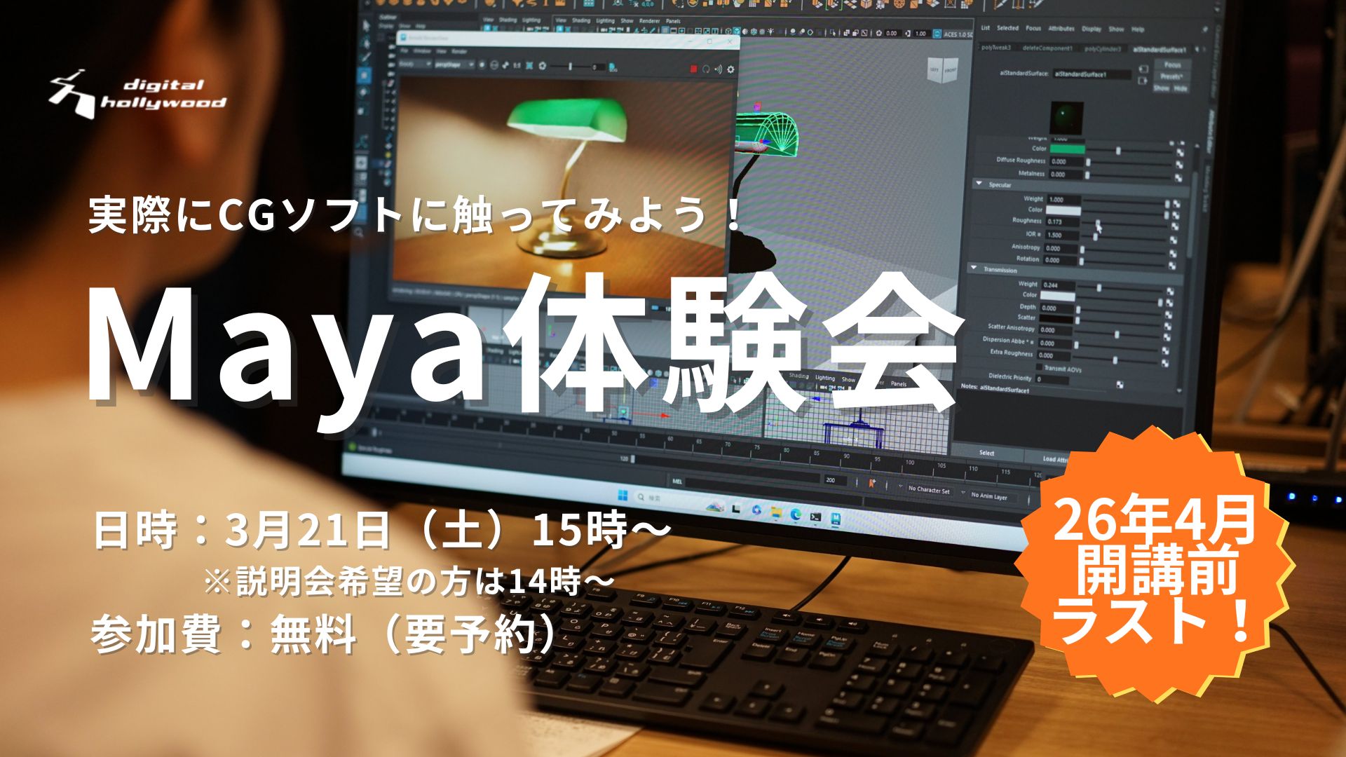 専科3DCGデザイナー専攻では、就職・転職に必要な定番のソフトウェアから最新の映像表現まで3DCG制作に必要な技術を1年で学びます。メインで学習するソフトはMayaです。