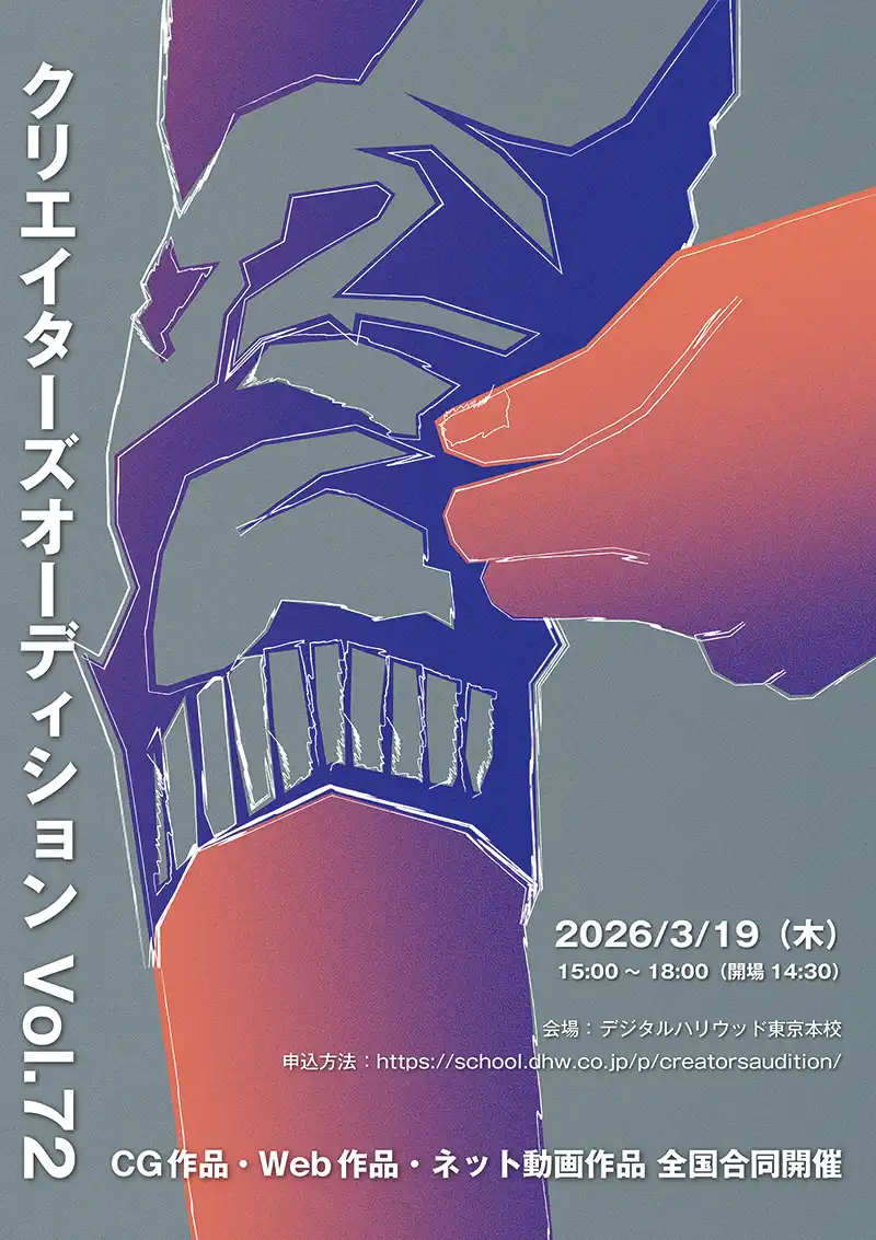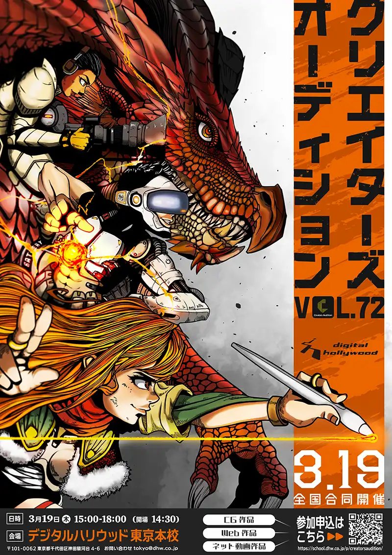 精鋭のクリエイターが集うイベントであることがしっかりと伝わり、大胆に用いたデジハリオレンジ×黒という強いコントラストが、動きのあるイラストと相まって非常に力強いデザインに仕上がっています。一方で、キャラクター同士の境目が曖昧でややごちゃごちゃした印象を受けるため、もう少し輪郭を明確にすると一人ひとりが際立ち、より魅力が伝わりやすくなると思います。また、下部の帯情報が画面ギリギリまで配置され窮屈に見えるため、余白を意識してゆとりを持たせると、勢いのある上部とのバランスが取れ、さらに完成度が高まりそうです。