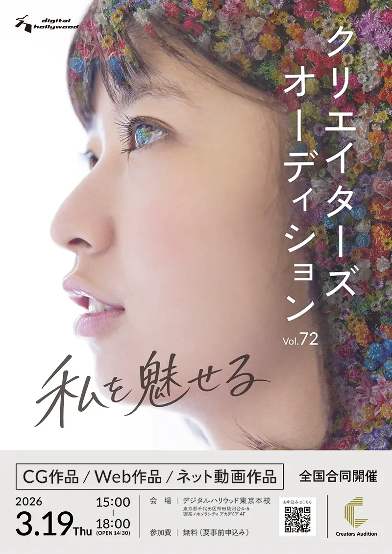 クリエイターとして一歩を踏み出す初々しさや透明感が丁寧に表現され、自由で豊かな創造性や希望に満ちた未来へ進むキラキラとした様子が伝わる、魅力的なデザインに仕上がっています。また、帯に掲載されたイベント情報の可読性も高く、ポスターとして充分に機能しています。一方で、デジハリロゴと人物の重なりや、情報の余白・整列の甘さがやや気になるため、写真を活かしたシンプルな構成だからこそ、タイポグラフィや細部のレイアウトまで丁寧に意識できると、より洗練された印象になると思います。