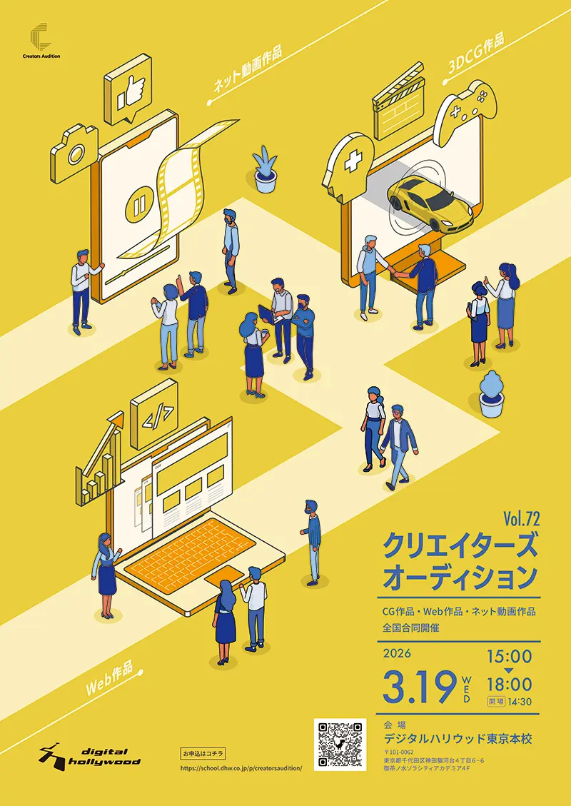 デジタルハリウッドでは全国の受講者と競い合える環境を提供し、課題制作に留まらない実践的な制作案件を「学内コンペ」という形で実施しています。