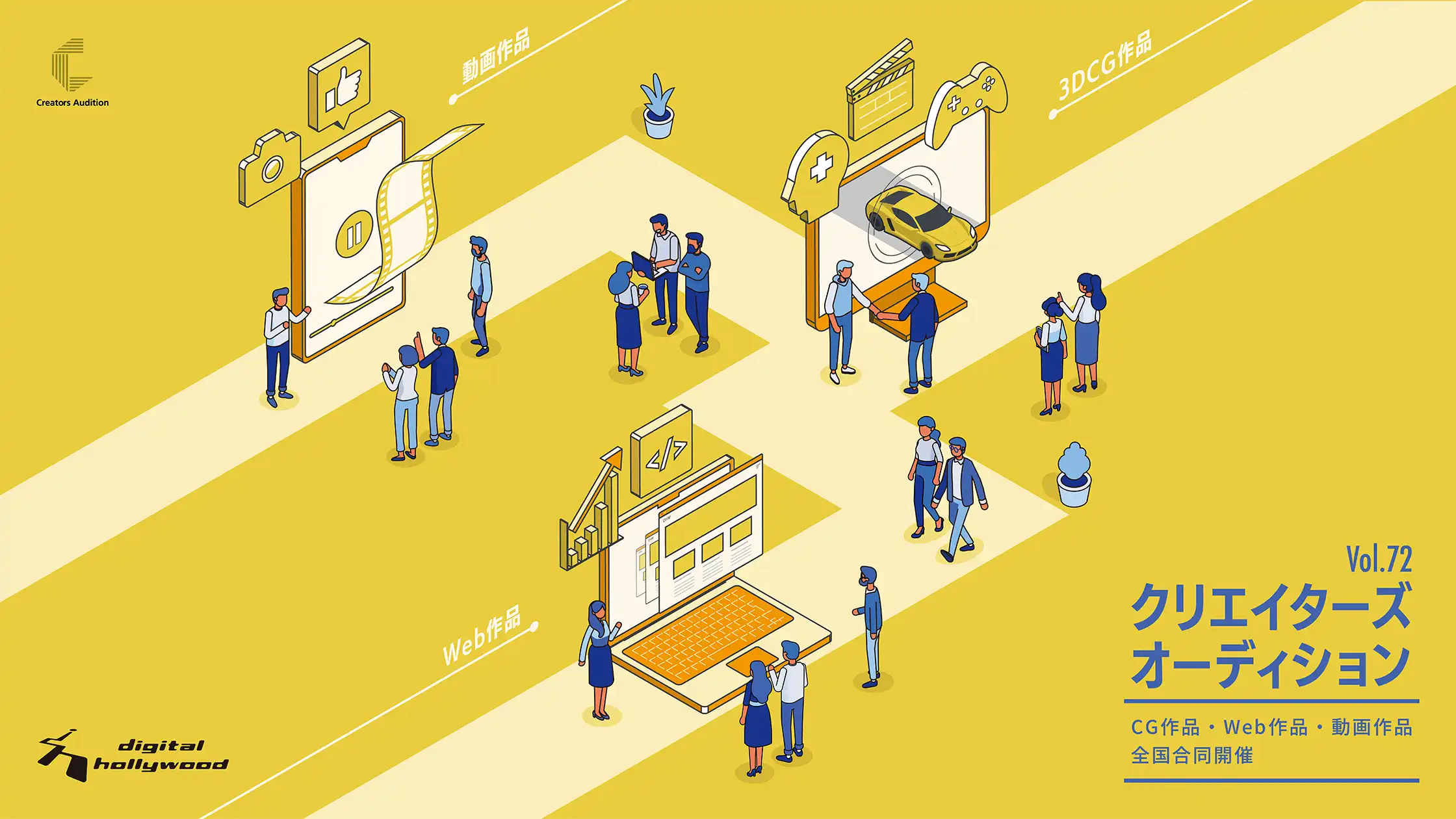 クリエイターズオーディションの雰囲気や内容がよく伝わる、わかりやすいビジュアルに仕上がっています。情報量は多いですが、余白を十分に取っていたり、トンマナやパースをしっかりと統一することですっきりと見やすくなっているところにレイアウトのセンスを感じます。