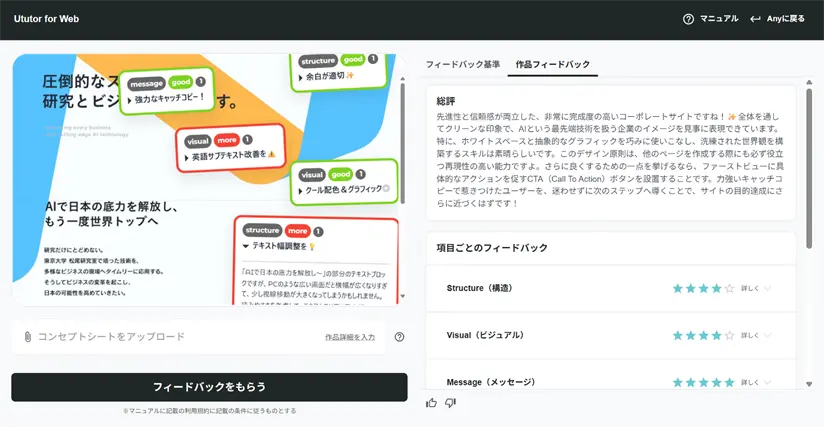 AIを学びのパートナーとして活用しながら、より良いアウトプットを完成させていきます。特徴は生成AIでクリエイティブの出力を行うのではなく、作品に対する講評やフィードバックから"気づき"や改善のヒントを受け取れます。在学期間中は24時間何度でも繰り返し壁打ちできます!グラフィックデザイン、WebUIデザイン、CG、動画などの制作プロセスを支援し、学習効果を高めることを目的としています。