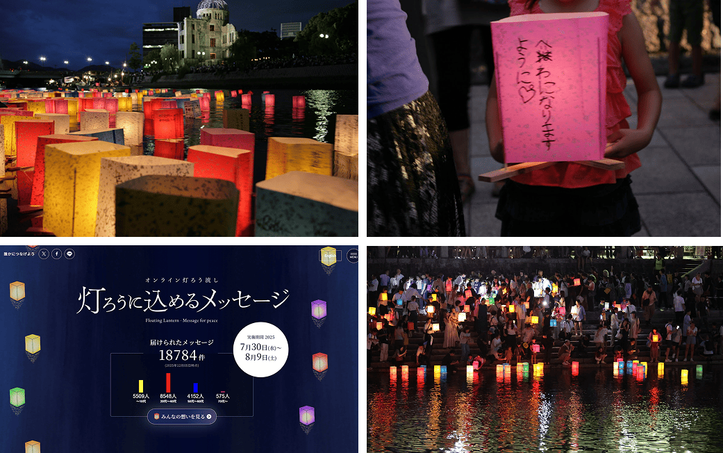 2015年からは、デジタルハリウッドSTUDIO広島のオーナーが社会活動として取り組む 「オンライン灯ろう流し(運営団体:ヒロシマ「 」継ぐ展実行委員会)」とも連携し、世界中から届く平和のメッセージを現地で投影しています。