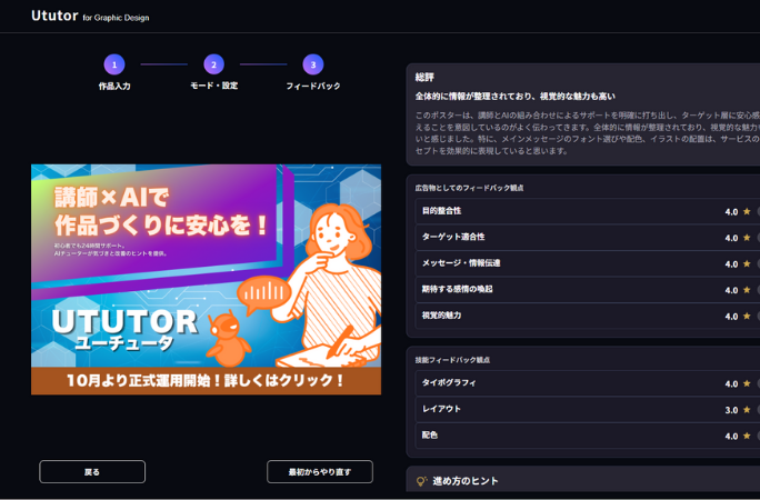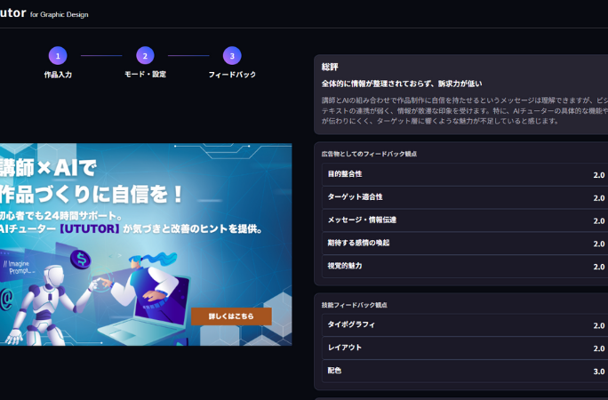作品をアップロードするだけ で、具体的な評価が得られる。目的にあわせた設定の変更も容易。 | 適切な評価結果を得るためには、生徒自身でプロンプトエンジニアリングや追加の入力が必要。 |