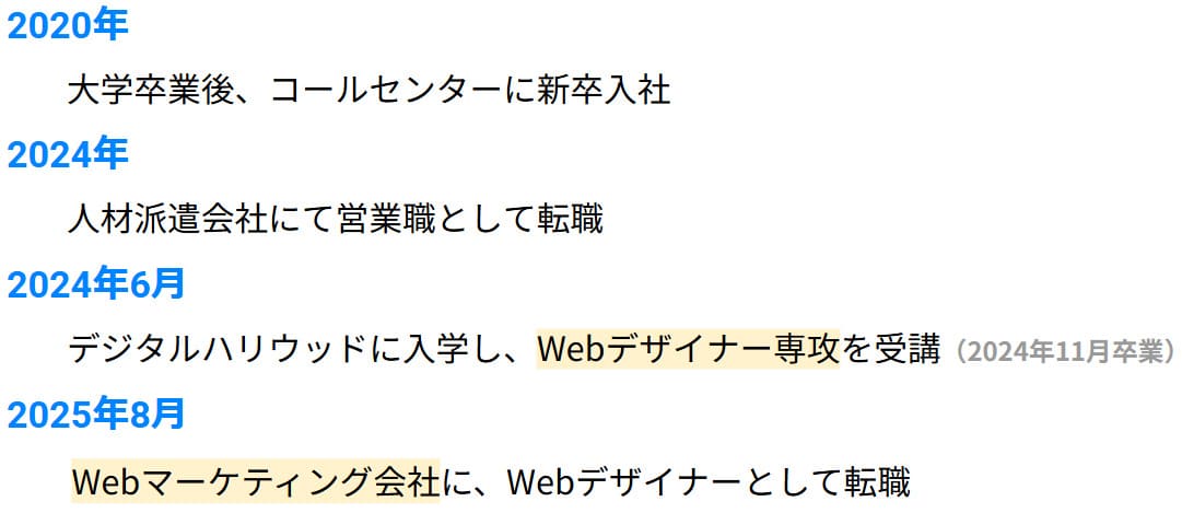 大学卒業後、「色んな業務を経験して早く出世したい!」と思い、アウトバウンドのコールセンターに入社。4年ほど営業責任者としての経験を経て、「一つの業務の営業を追求してみたい」と思い、転職エージェントにて営業事務に従事。その後、デジタルハリウッドSTUDIOなんばに入学し、卒業後はWebマーケティング会社にてWebデザイナーとして転職。