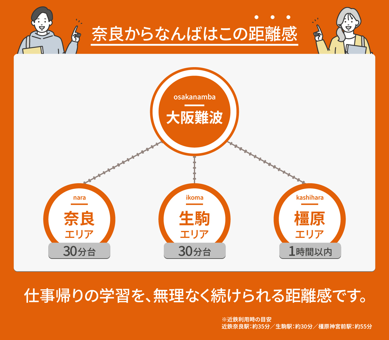 最初は「生駒から通うのは難しそう」と感じていたものの、近鉄奈良線でなんばまで25分+地下から雨に濡れずで校舎に行けることを知って安心。
