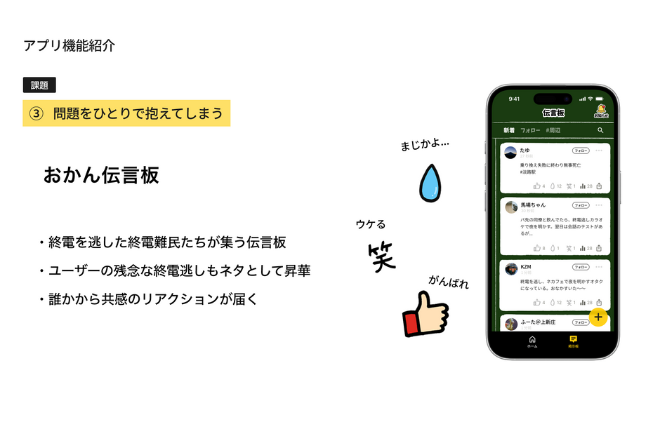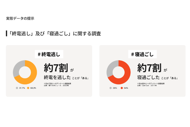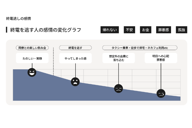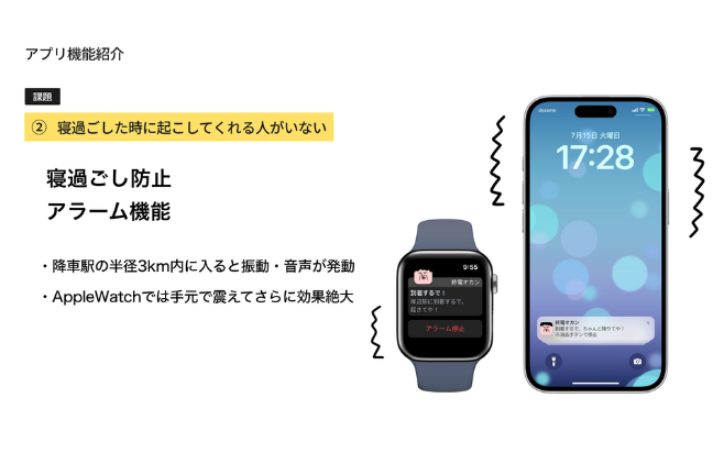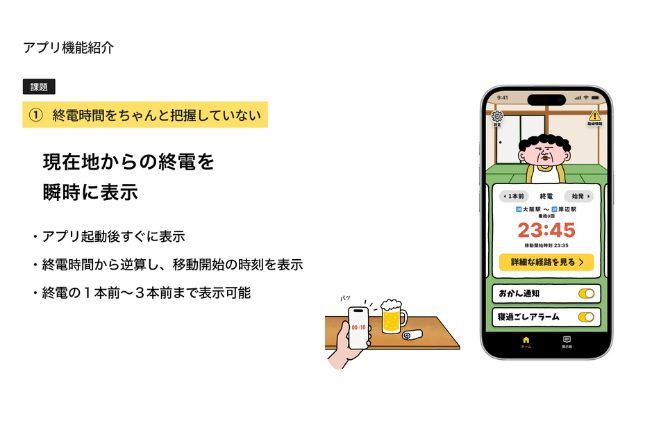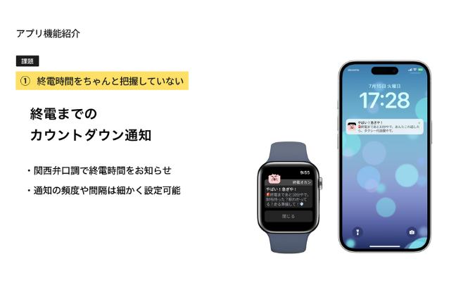 ユーザーが抱える「終電時間を把握していない」という課題を的確に捉え、UI上での解決方法をしっかりと設計されています!