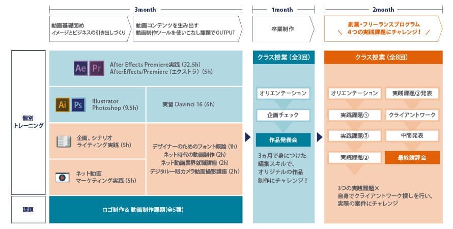 動画クリエイター専攻では、縦型動画やVlog編集、文字アニメーションを活用したミュージックビデオ制作など、「今の時代に合った動画表現」を学べるカリキュラムをご用意しています。教材を進めていくことで動画編集の基礎を身につけることが可能です。