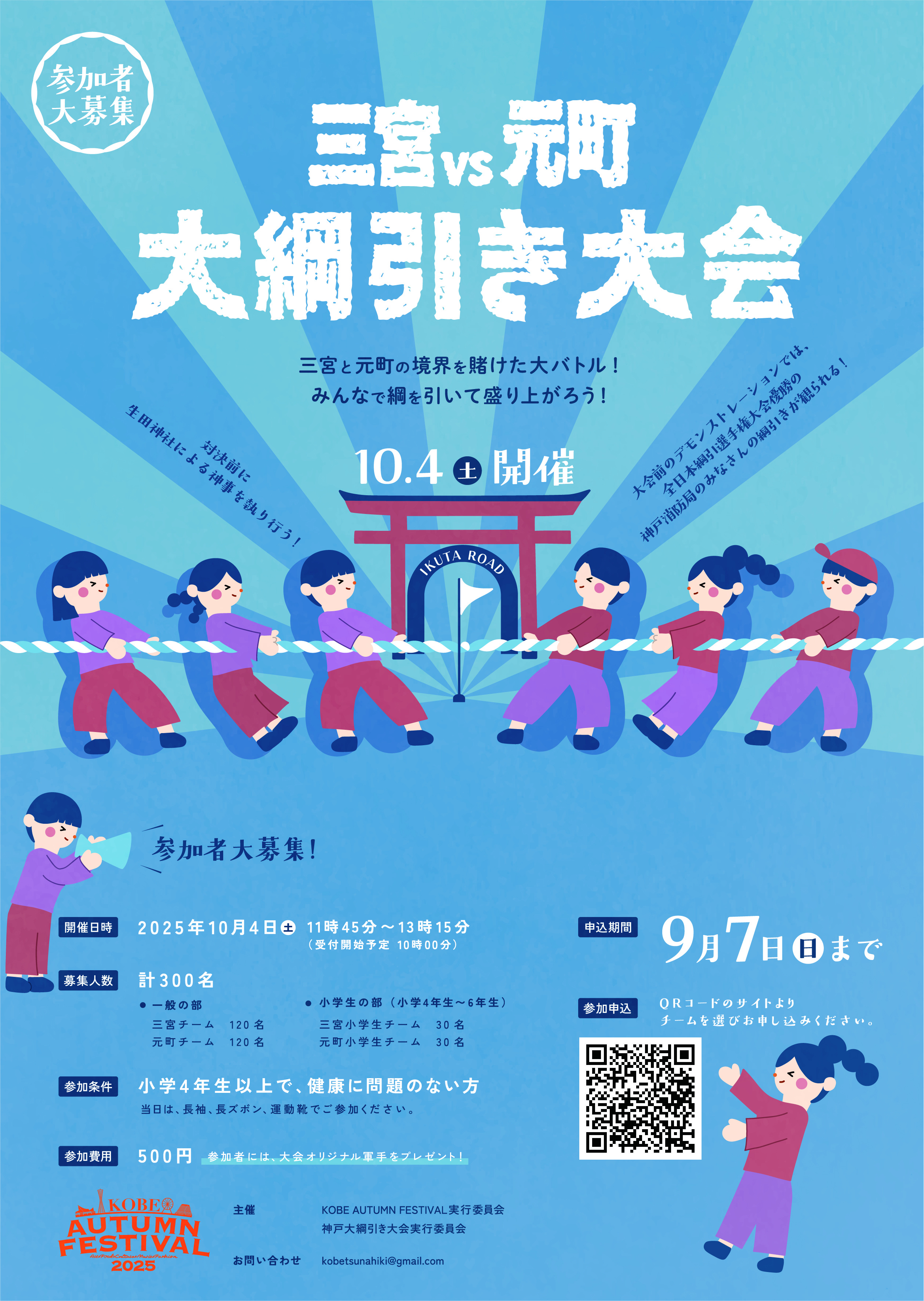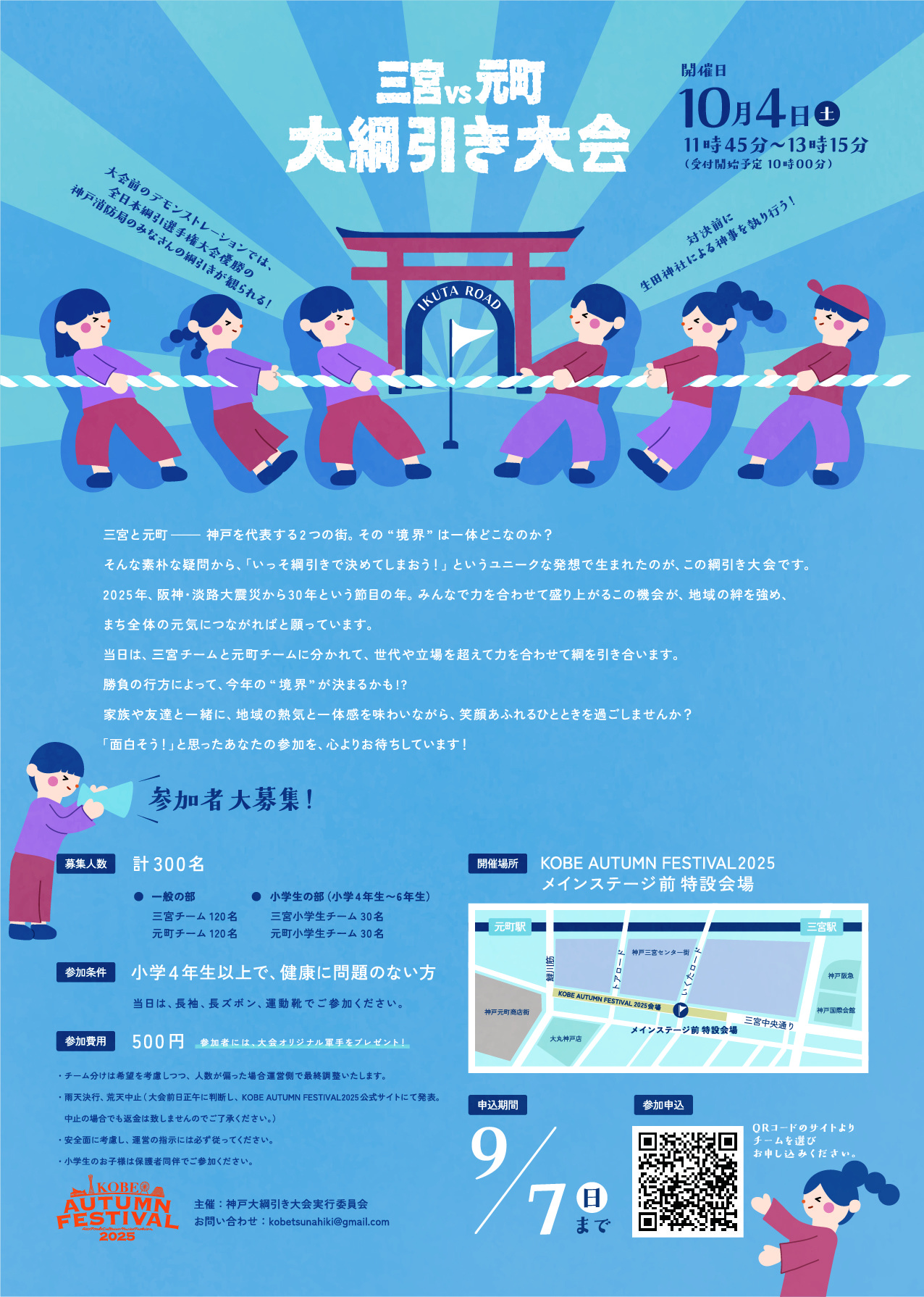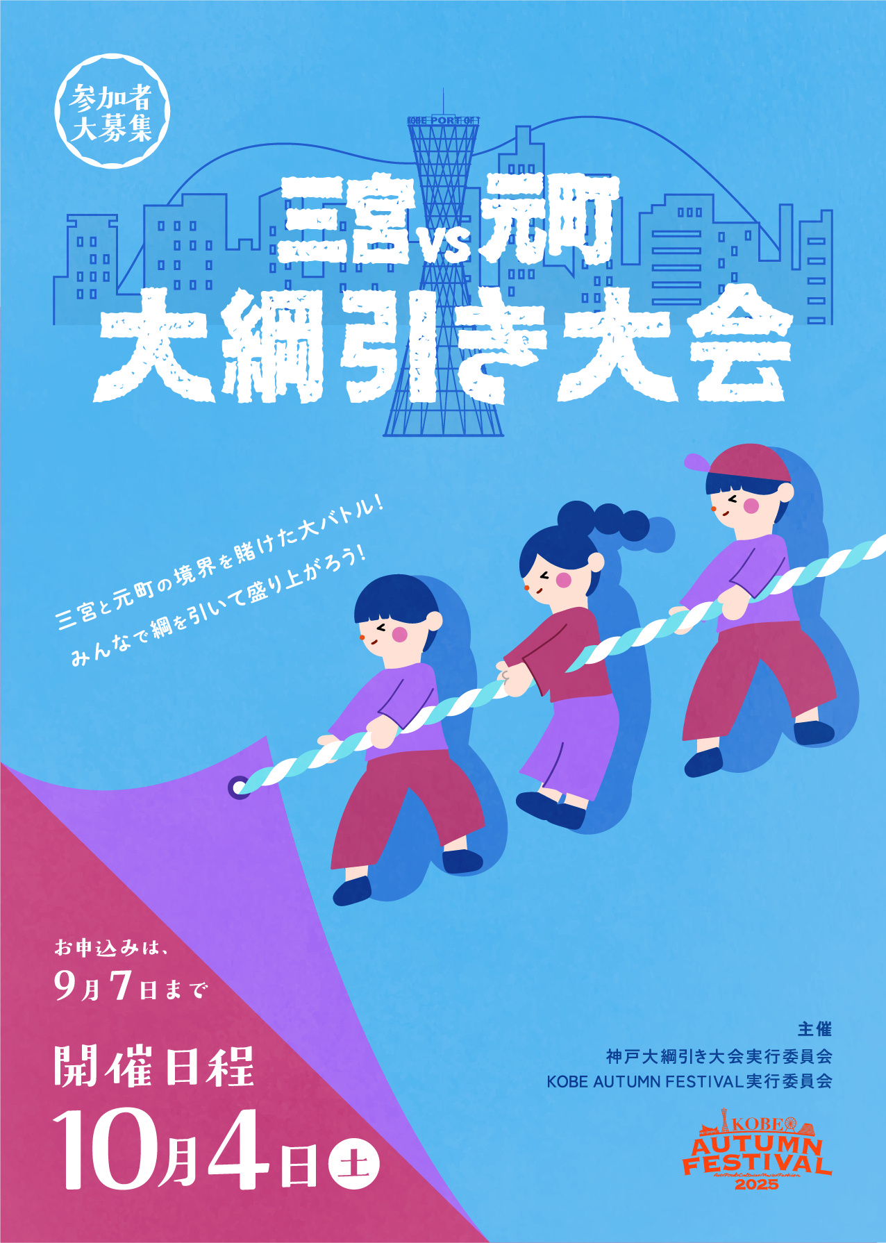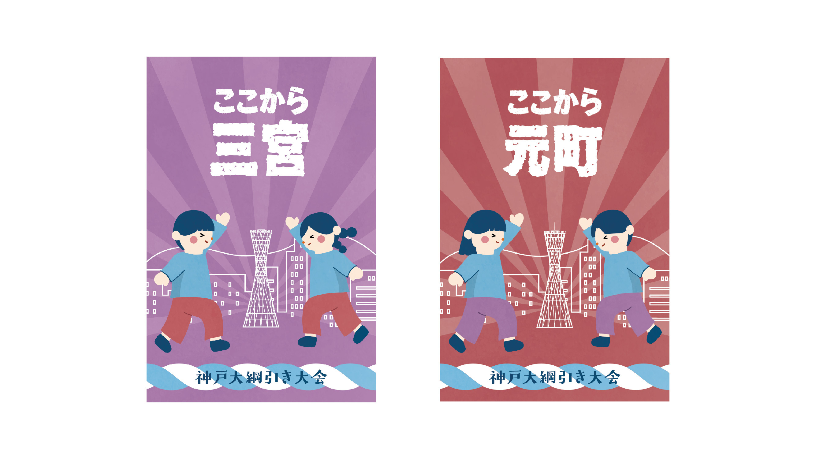 大会当日の雰囲気が伝わるよう、生田ロードの鳥居を背景に綱引きを行っているデザイン。放射状のデザインにより、視線誘導と臨場感の演出も行われています。