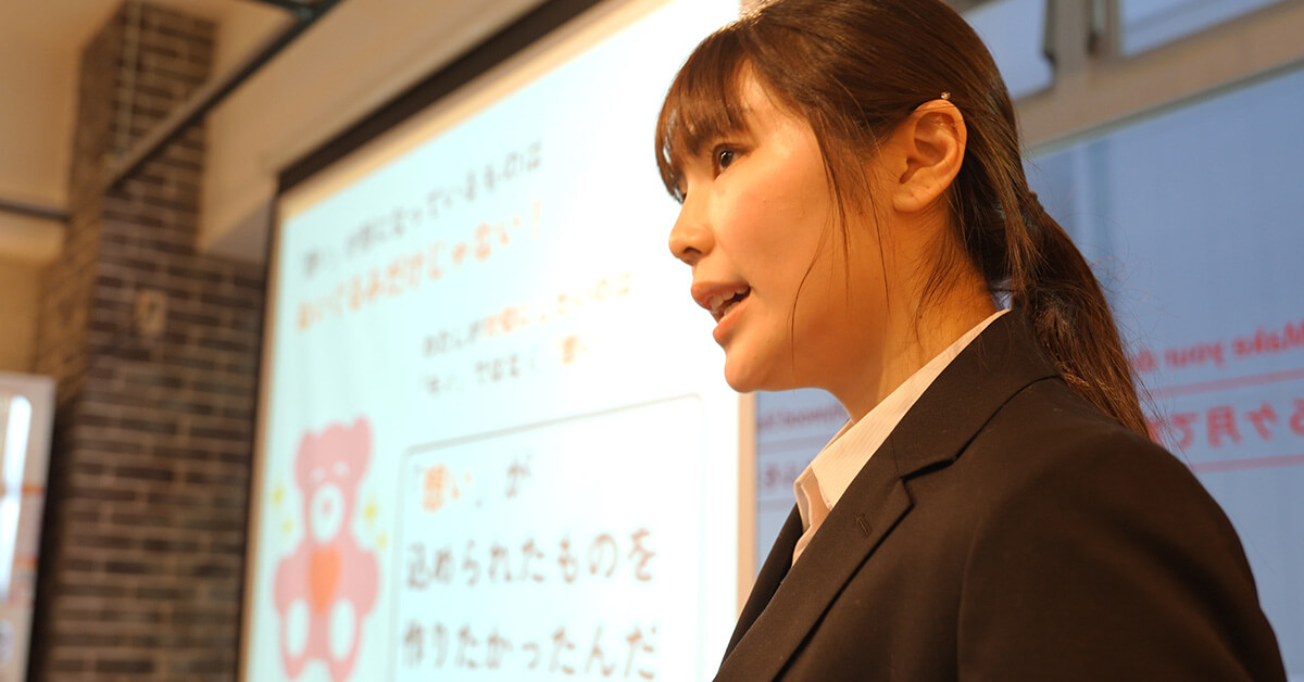 クリエイティブ業界を目指す卒業生が企業担当者の前でプレゼンを行い、