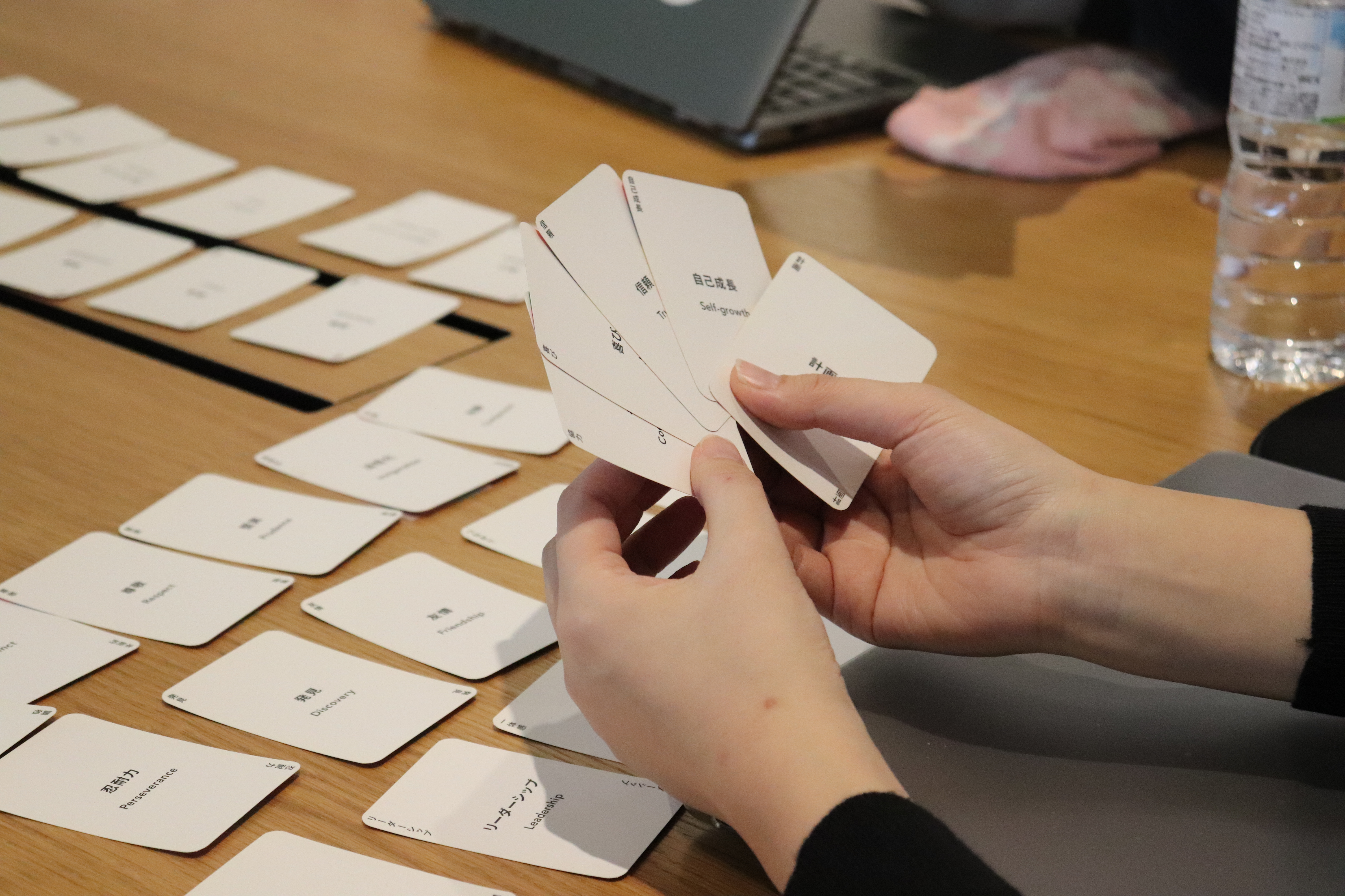 最初のワークでは、 「価値観カード」 を使って自分にしっくりくる言葉を選んでいくというもの。