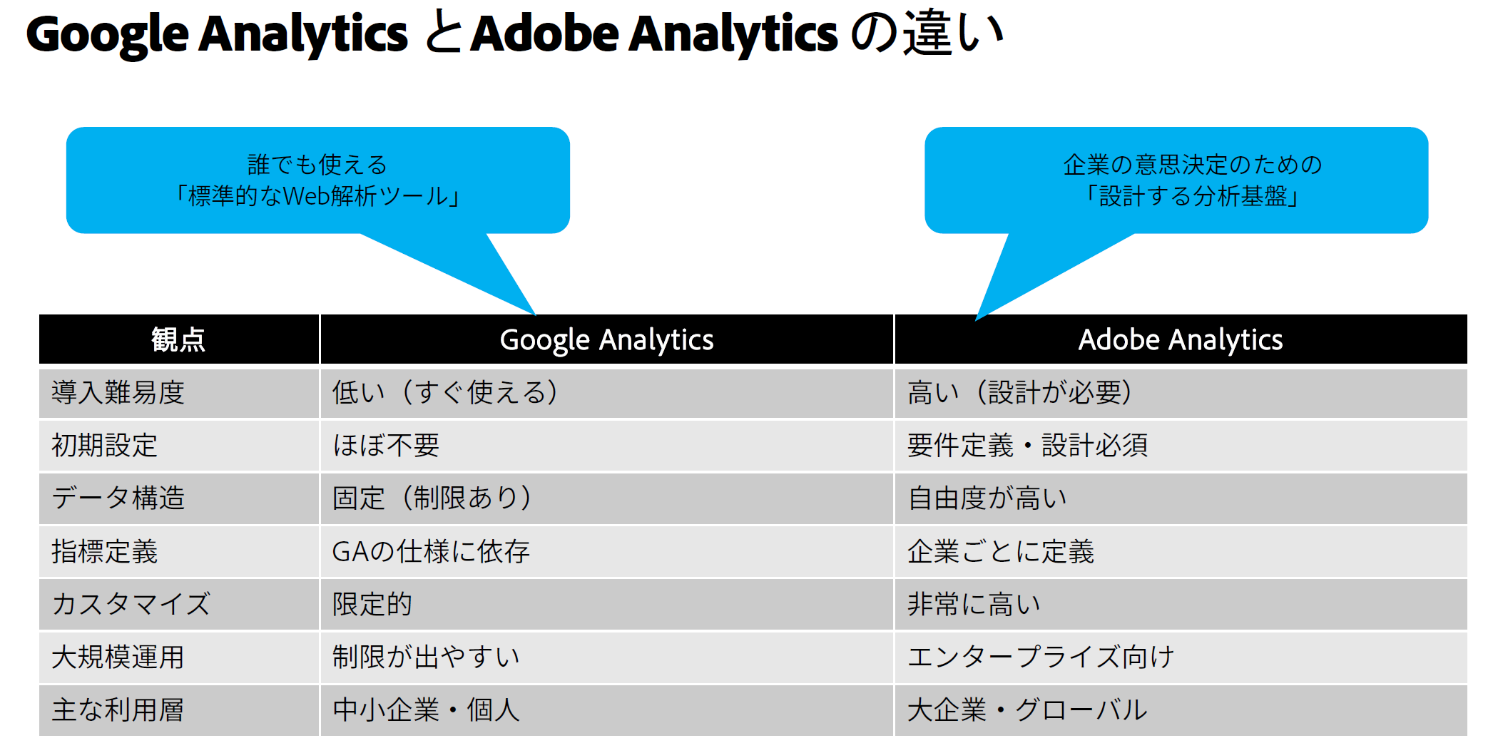 Adobe AnalyticsをはじめとするAdobe Experience Cloud製品は、詳細なセグメント分析や予測、パーソナライズなど、マーケティング戦略に直結する高度な機能を備えています。