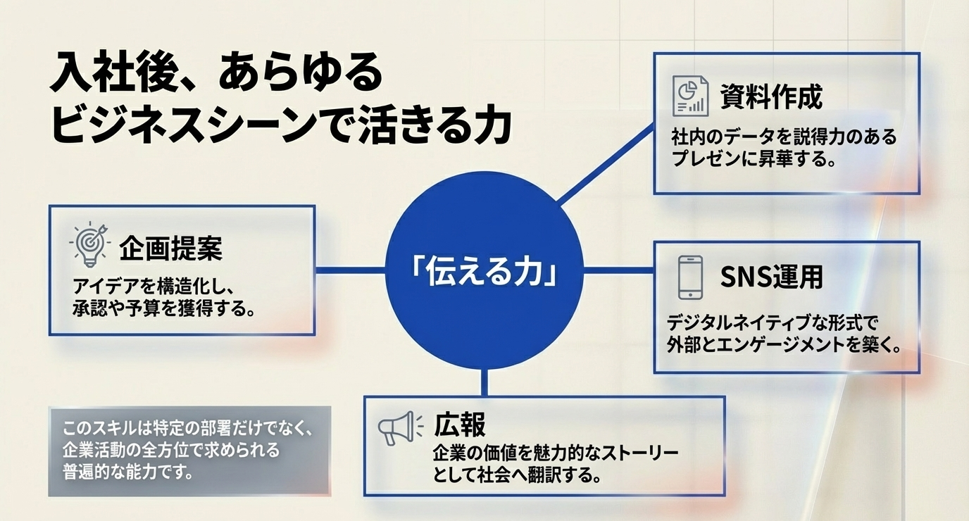 就活でのアピール材料になるのはもちろん、入社後も、資料作成、SNS運用、広報、企画提案など、さまざまな場面で活きる力になります。