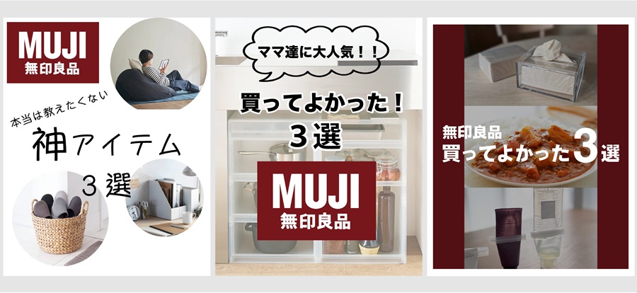 今回のお題は、あずき色のデザインでおなじみの「無〇良品」さんをテーマにした「おすすめ3選!」というInstagram投稿のサムネイル。