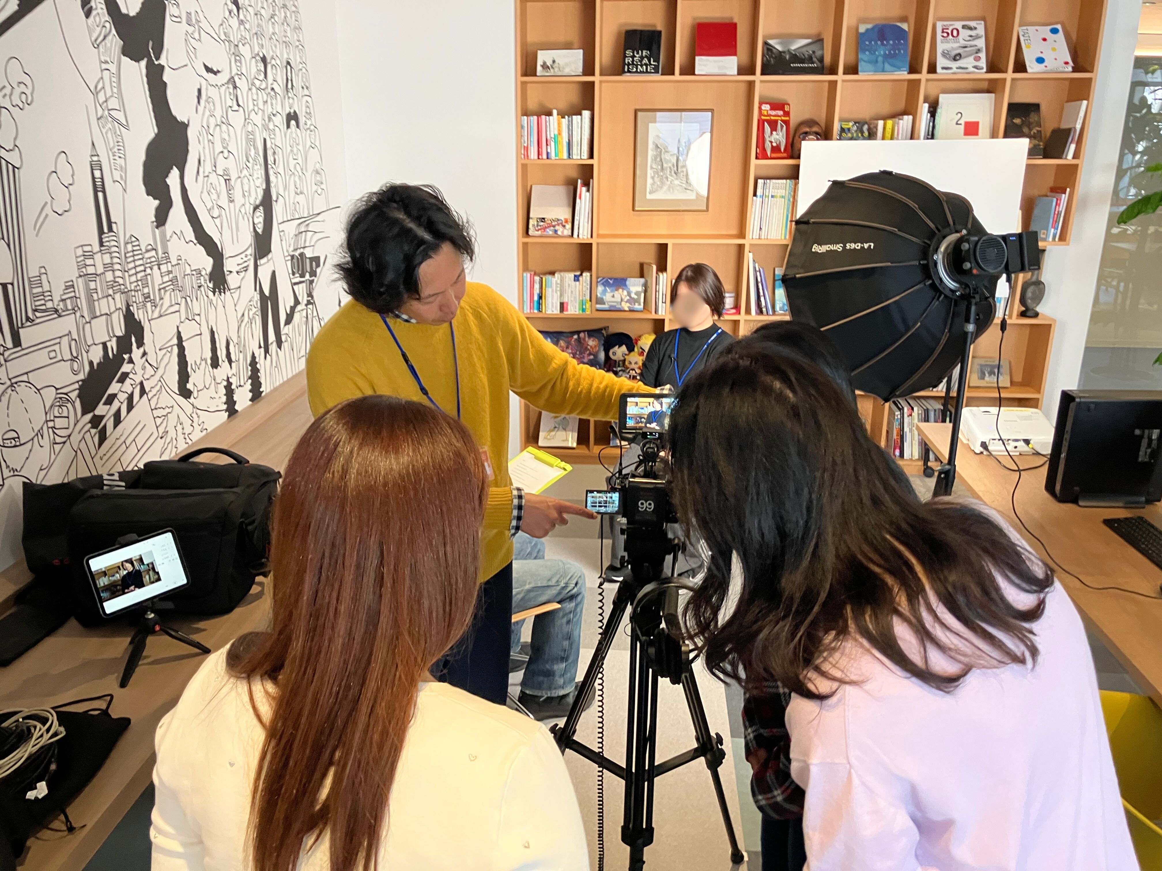山本さんが実際に使用している撮影機材を使い、インタビュアーと撮影者をローテーションで回していく実践形式で撮影を行いました。※回答者はデジハリスタッフが担当させていただきました。