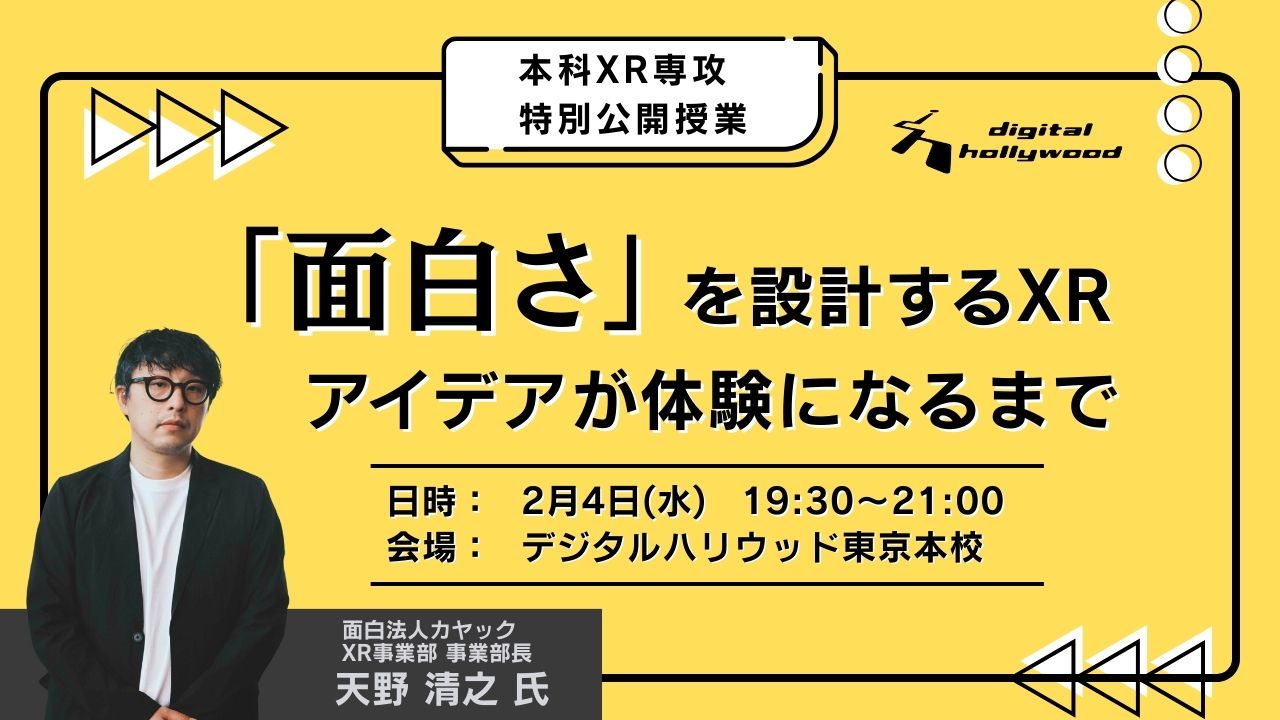 今回は、遊び・ストーリー・テクノロジーを組み合わせ、XR体験を創り続けている面白法人カヤック XR事業部 事業部長 天野 清之氏をお招きし、特別授業を行います。