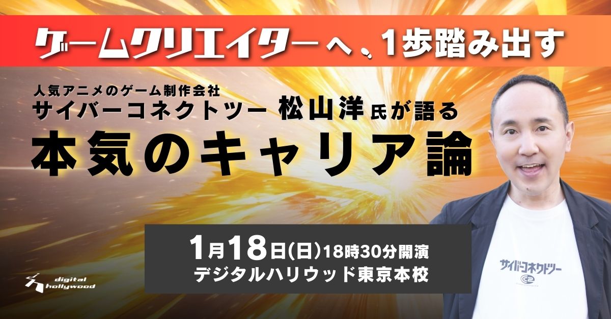 デジタルハリウッド東京本校では、1/18(日)に 株式会社サイバーコネクトツー 代表取締役 松山 洋氏 をお呼びして、ゲーム業界のキャリアについて語っていただく特別セミナーを開催します!