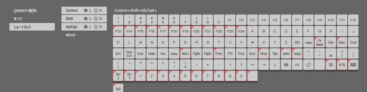 そしたらツール下部の欄を ショートカット に切り替えて、 Control 、 Shift 、 Alt/Opt をそれぞれ ON にします。 (おそらく左右 (L/R) はどちらでも可)